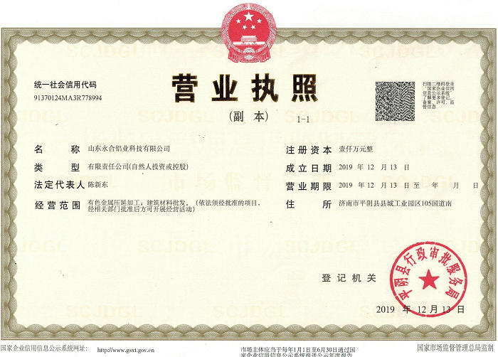 山東永合鋁業(yè)科技有限公司的誠(chéng)信、實(shí)力和產(chǎn)品質(zhì)量獲得業(yè)界的認(rèn)可。歡迎各界朋友蒞臨參觀、指導(dǎo)和業(yè)務(wù)洽談。